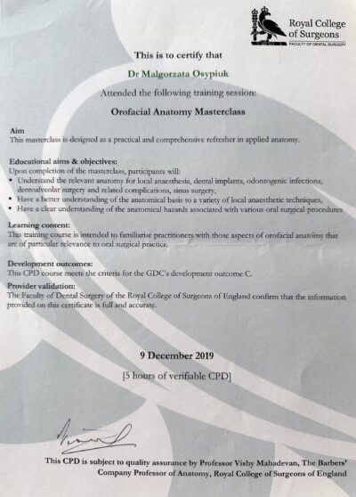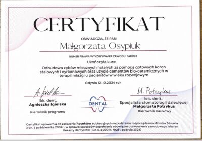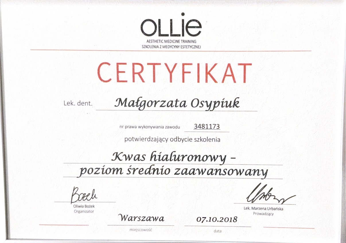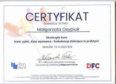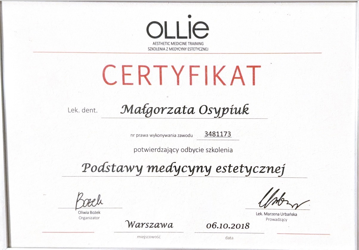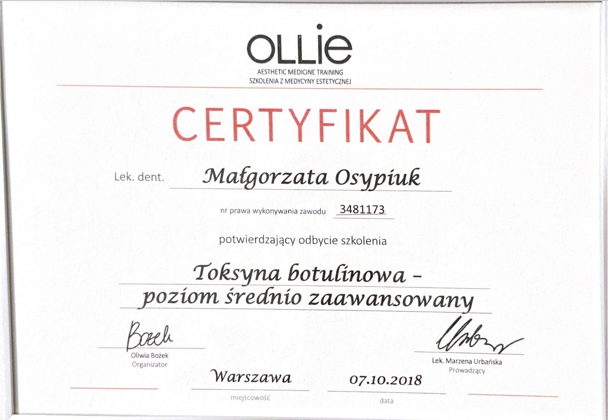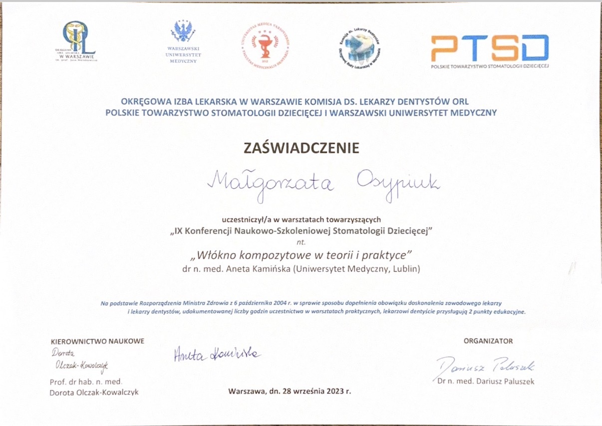 Absolwentka Uniwersytetu Jagiellońskiego Collegium Medicum w Krakowie. W 2018 roku staż podyplomowy częściowo realizowała w Południowej Afryce, gdzie była zaangażowana w lokalne projekty stomatologiczne. W 2024 roku ukończyła specjalizację w dziedzinie stomatologii dziecięcej. W międzyczasie ukończyła studia podyplomowe z periodontologii we Włoszech otrzymując z wyróżnieniem tytuł Mastera Periodontologii oraz dwuletnie studia na kierunku stomatologii estetycznej na Warszawskim Uniwersytecie Medycznym. Nieustannie poszerza swoją wiedzę w licznych kursach krajowych i zagranicznych, aby zawsze oferować pacjentom leczenie na najwyższym poziomie.