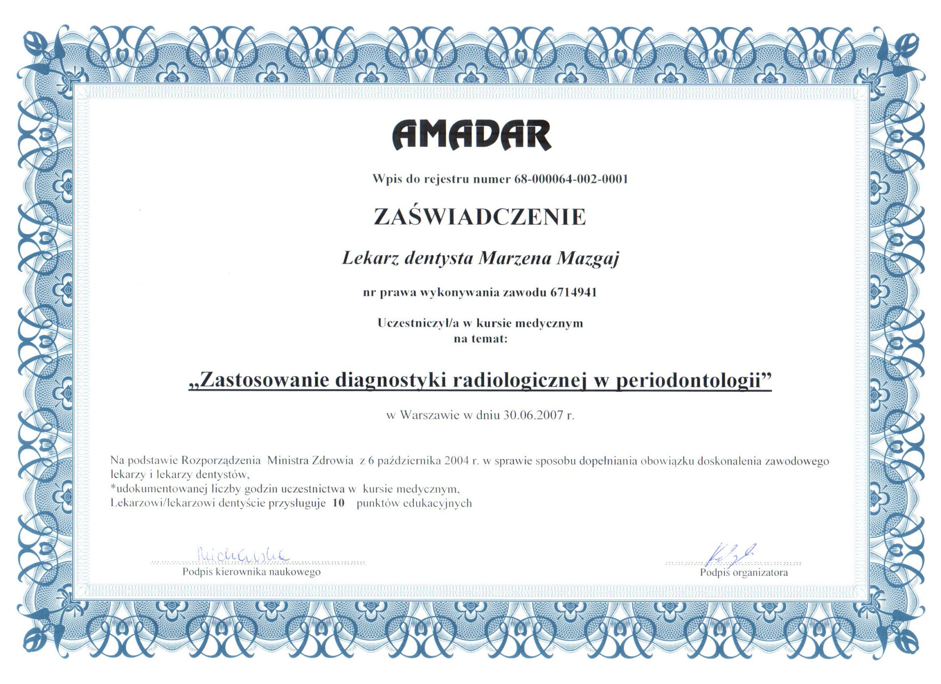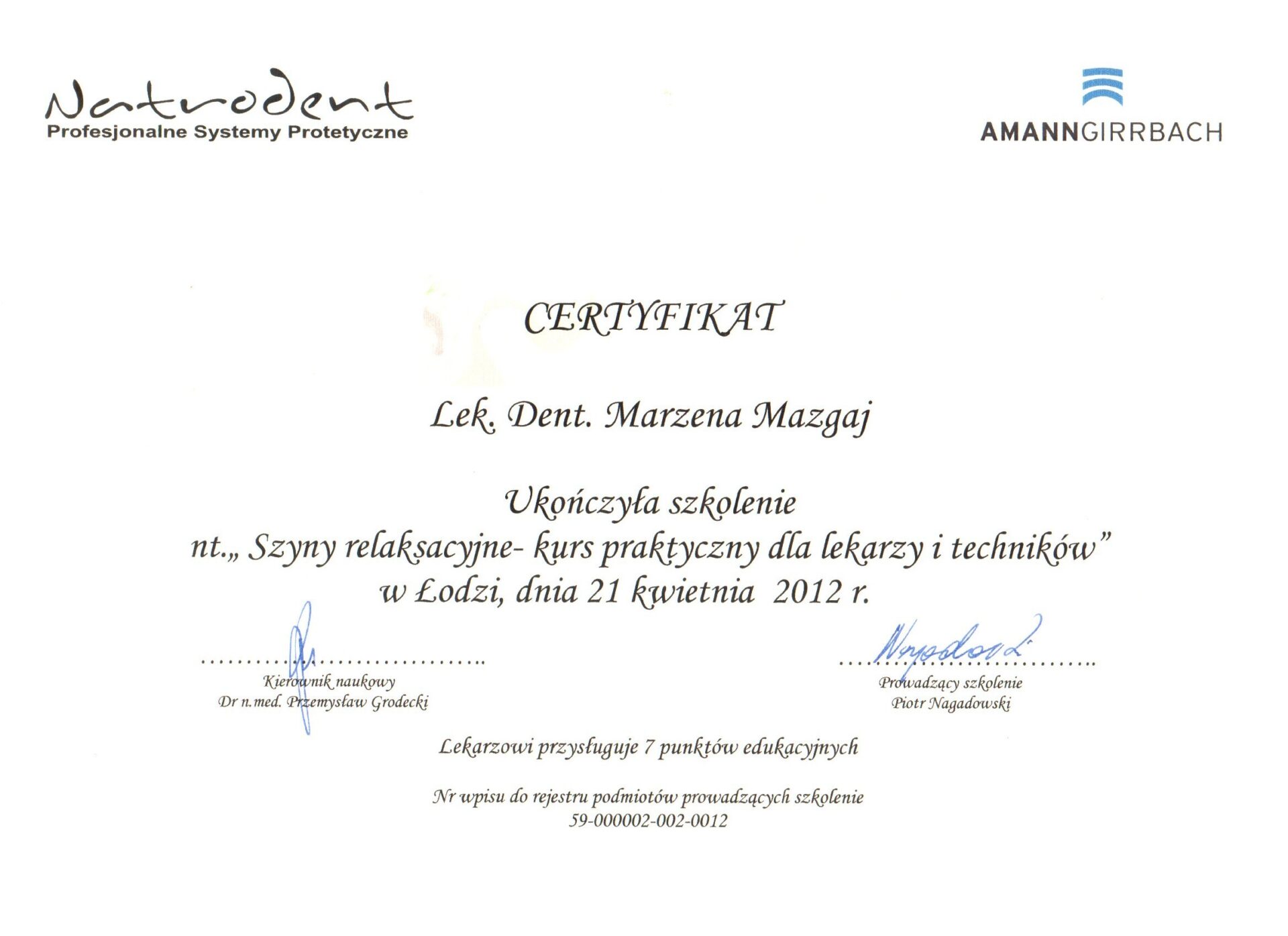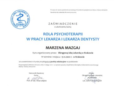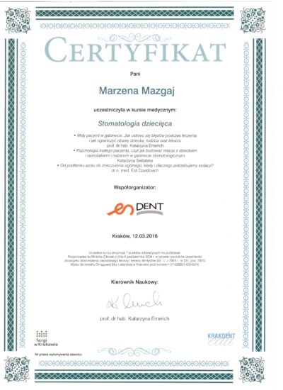 Opiekę nad pacjentami w „Skrzacie” sprawuje w zakresie stomatologii zachowawczej, stomatologii dziecięcej, profilaktyki ogólnej i periodontologicznej.
