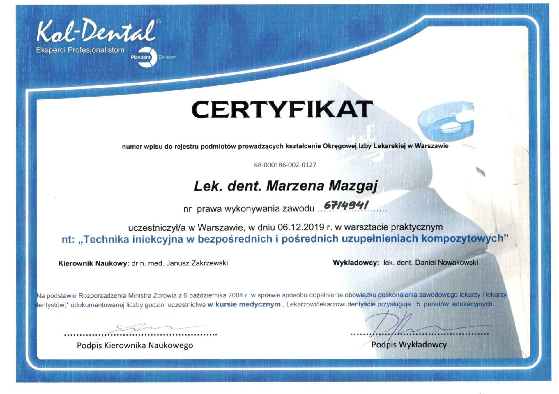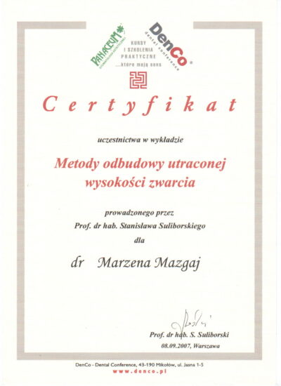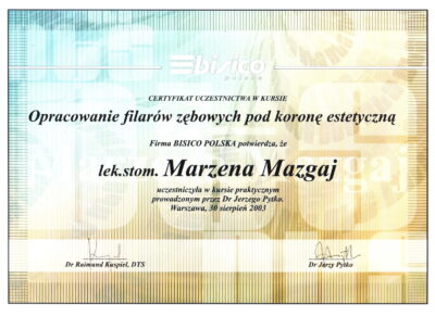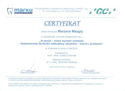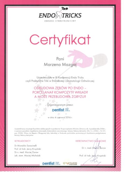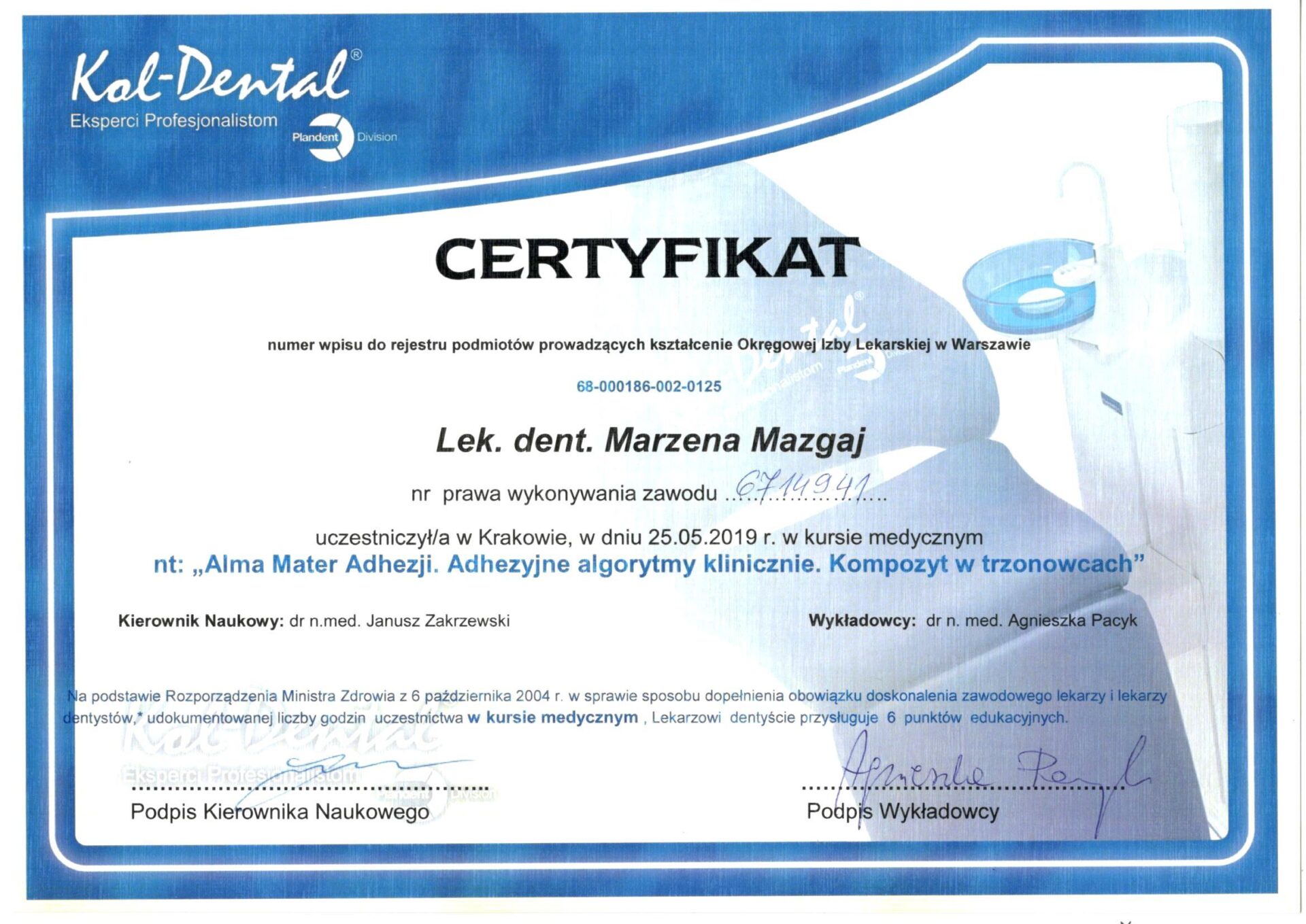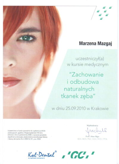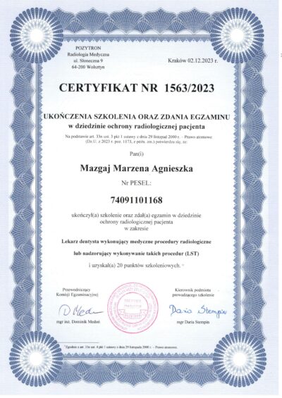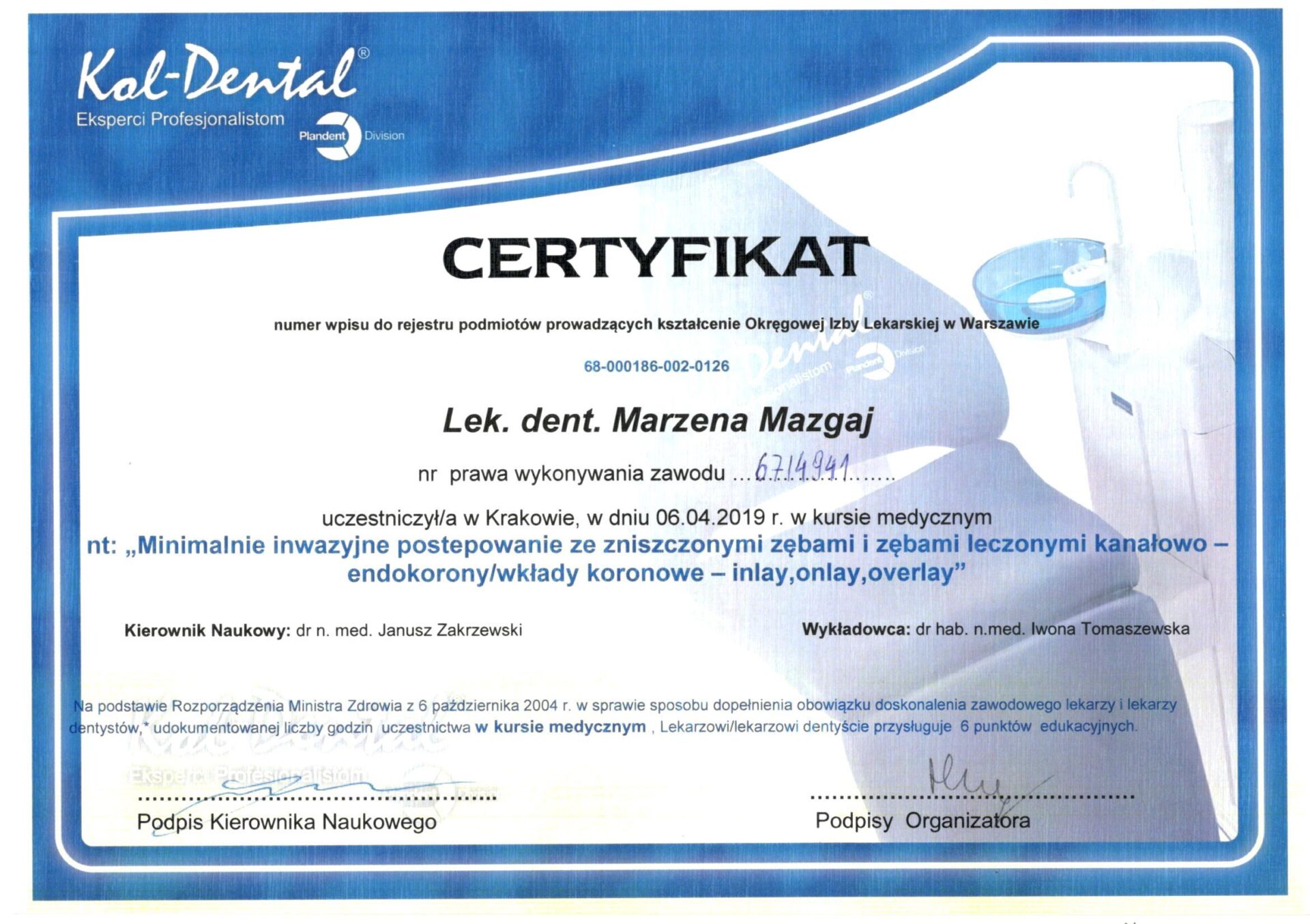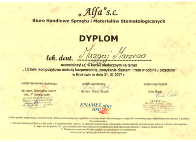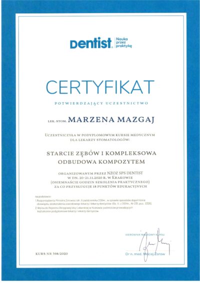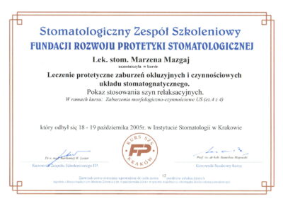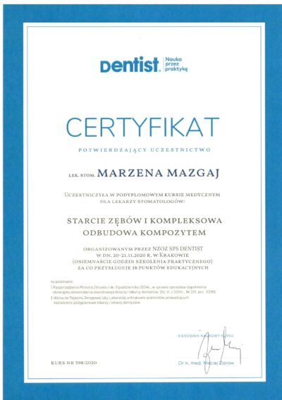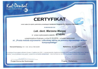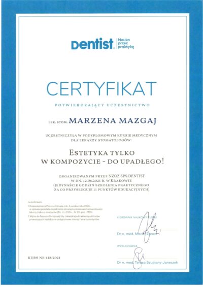 Jest absolwentką Collegium Medicum Uniwersytetu Jagiellońskiego. W pracy zawodowej skupia się na kompleksowym rozpoznaniu potrzeb leczenia dentystycznego pacjentów dorosłych i dzieci. Realizuje koncepcję stomatologii minimalnie inwazyjnej, której celem jest maksymalna ochrona naturalnego uzębienia pacjentów. Natura tworzy najwspanialsze dzieła, dlatego każdy ząb zasługuje na odbudowę idealną pod kątem anatomii, funkcji i estetyki aby mógł służyć człowiekowi przez całe życie.