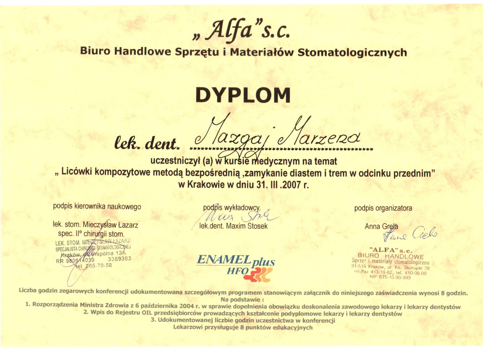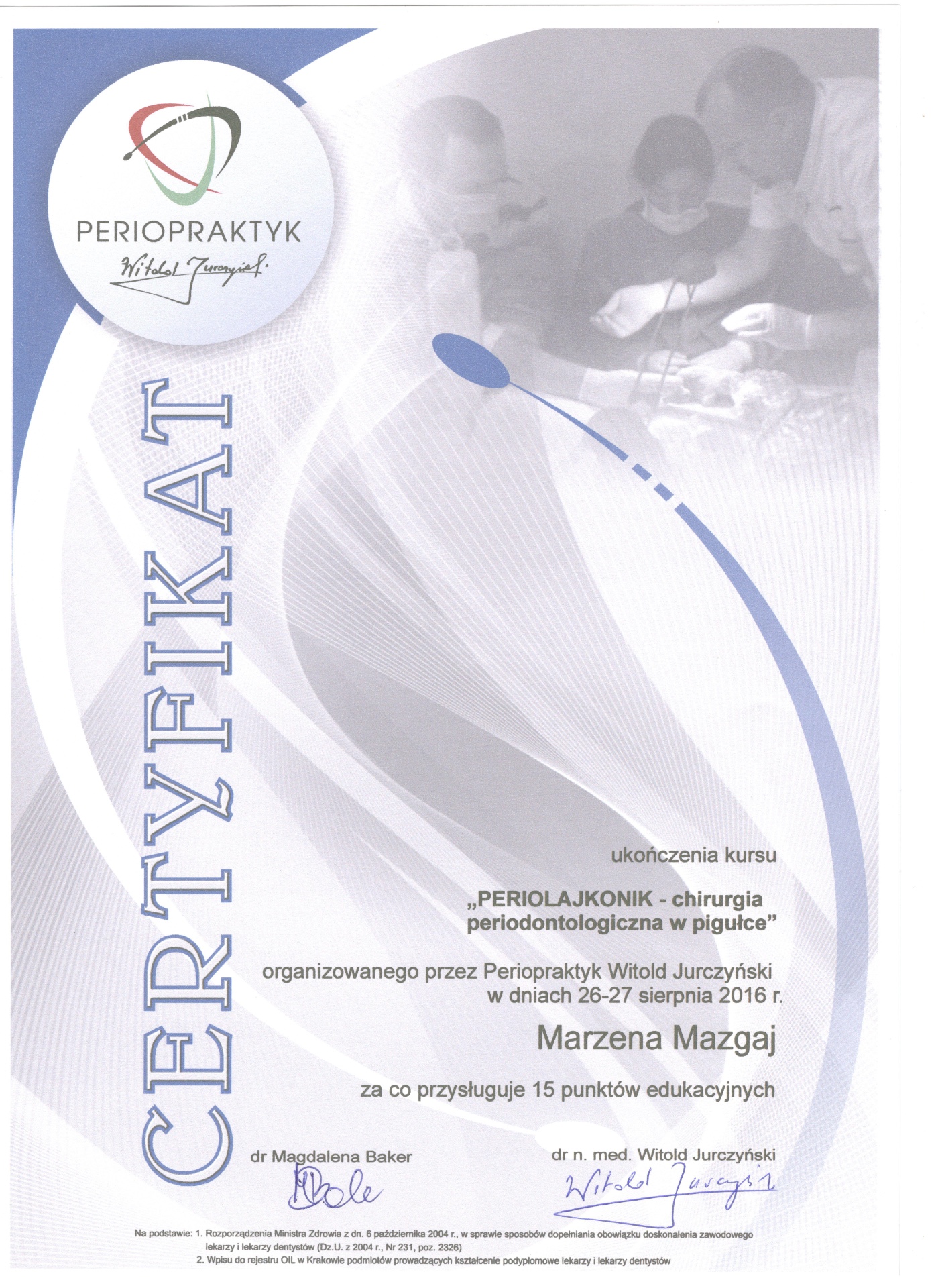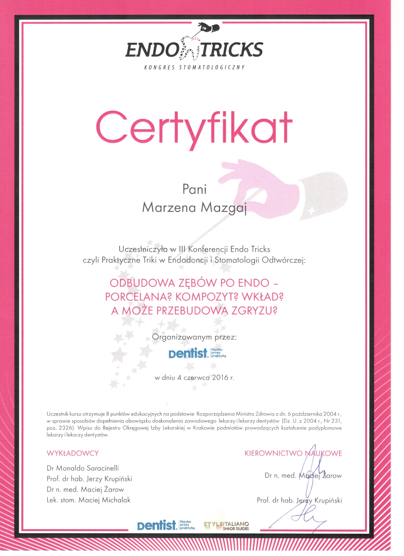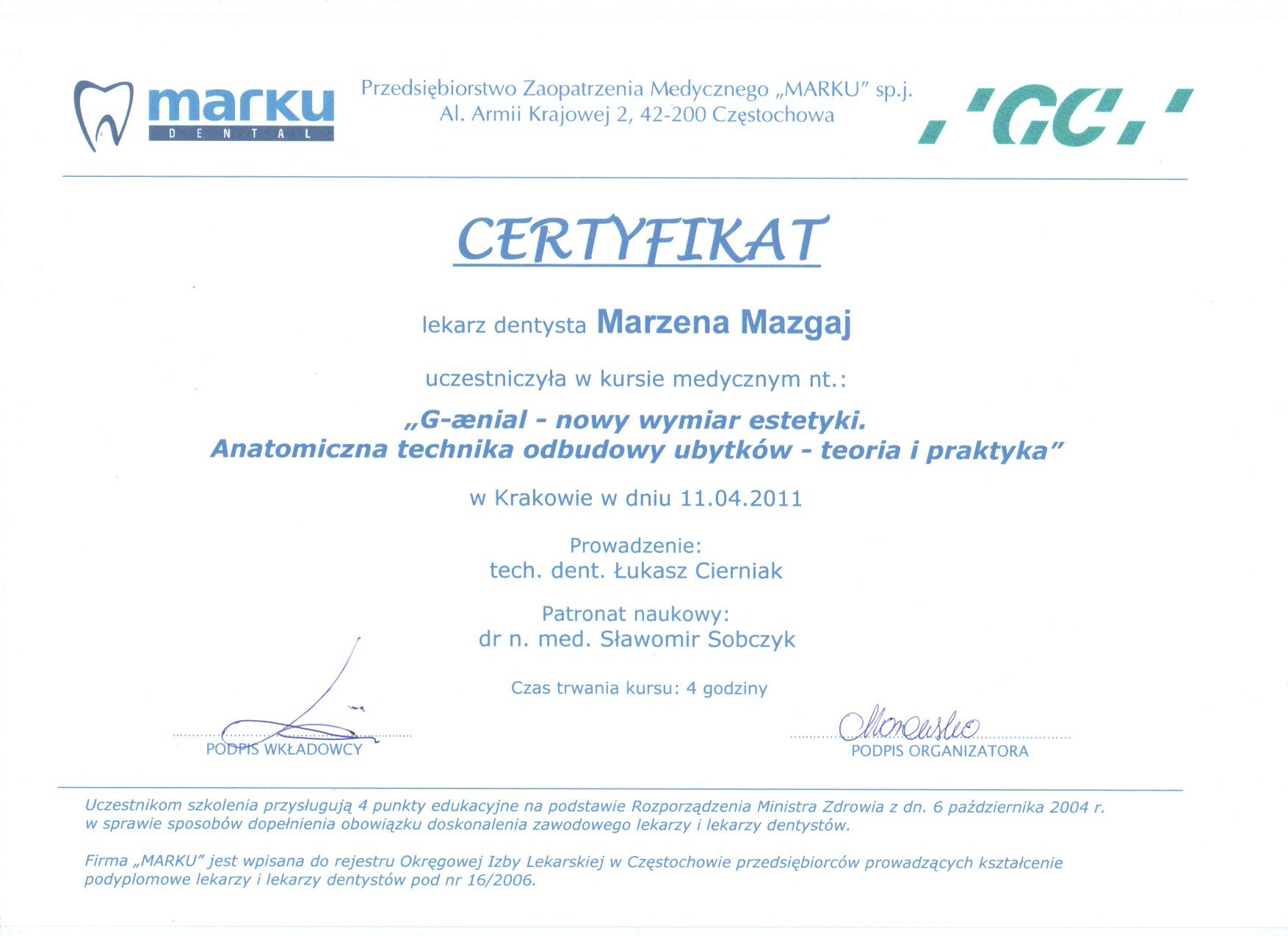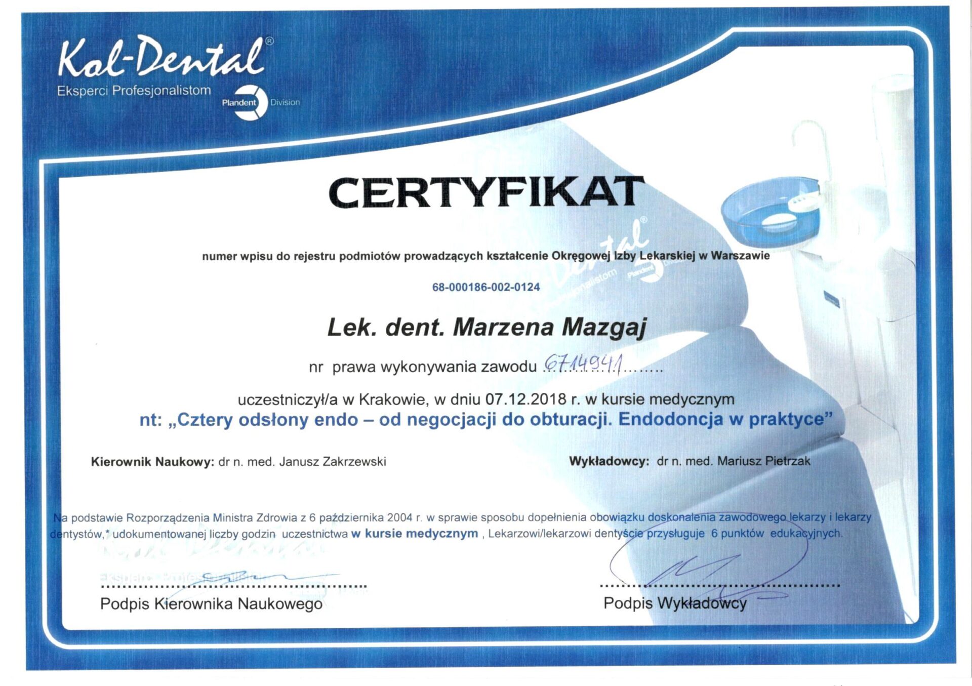 Jest absolwentką Collegium Medicum Uniwersytetu Jagiellońskiego. W pracy zawodowej skupia się na kompleksowym rozpoznaniu potrzeb leczenia dentystycznego pacjentów dorosłych i dzieci. Realizuje koncepcję stomatologii minimalnie inwazyjnej, której celem jest maksymalna ochrona naturalnego uzębienia pacjentów. Natura tworzy najwspanialsze dzieła, dlatego każdy ząb zasługuje na odbudowę idealną pod kątem anatomii, funkcji i estetyki aby mógł służyć człowiekowi przez całe życie.