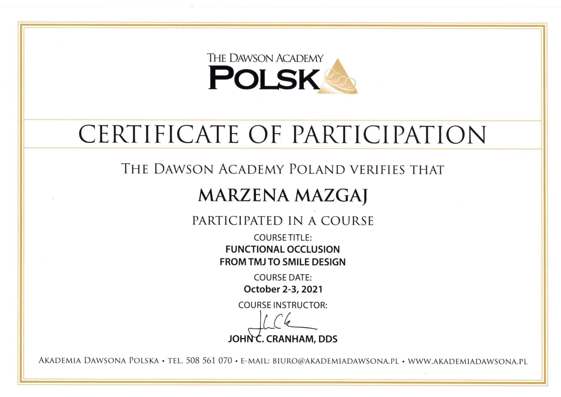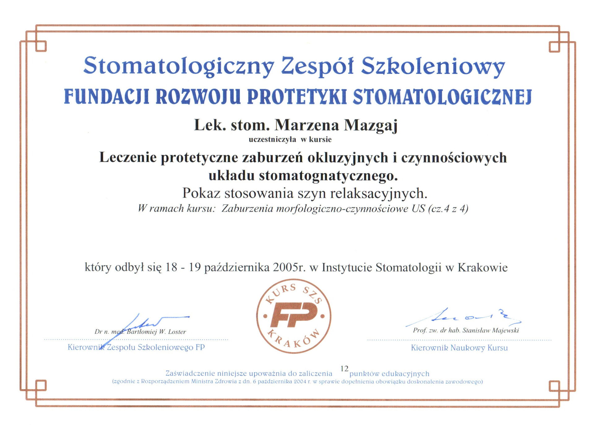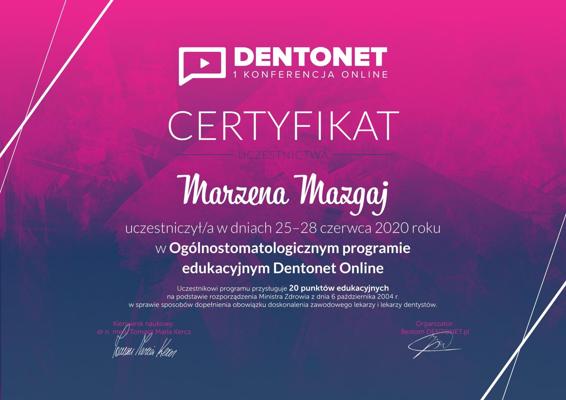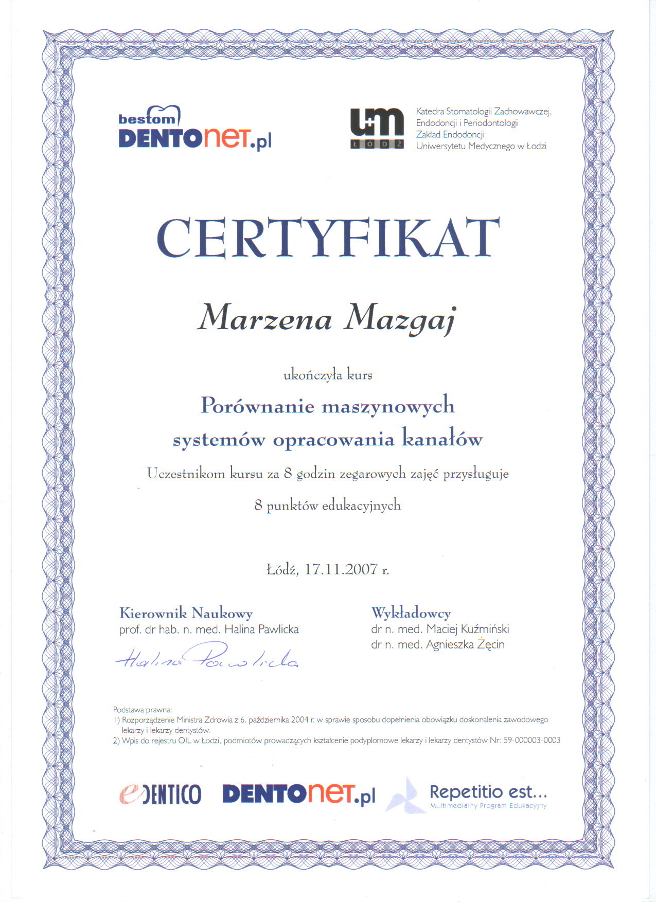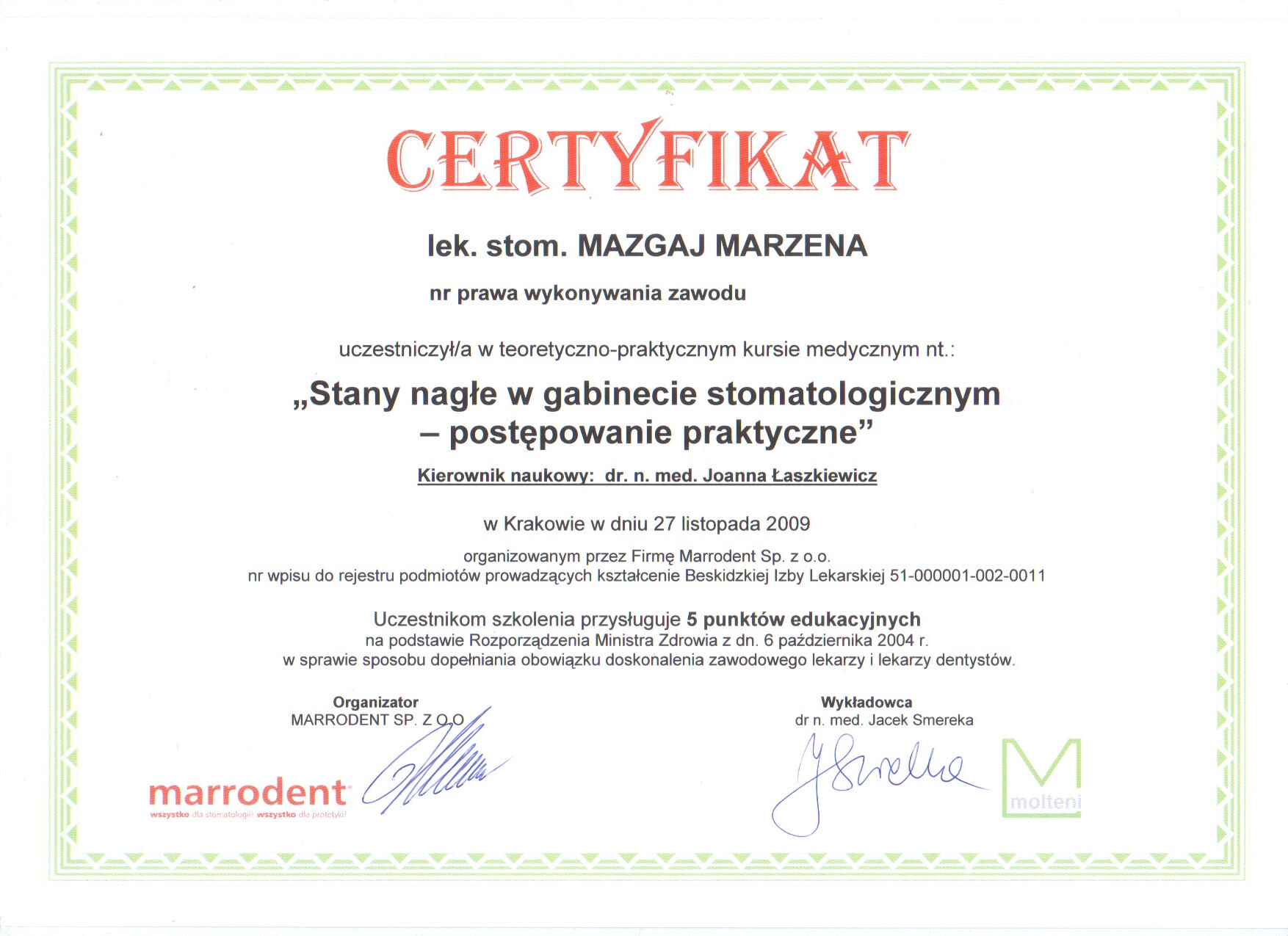 Jest absolwentką Collegium Medicum Uniwersytetu Jagiellońskiego. W pracy zawodowej skupia się na kompleksowym rozpoznaniu potrzeb leczenia dentystycznego pacjentów dorosłych i dzieci. Realizuje koncepcję stomatologii minimalnie inwazyjnej, której celem jest maksymalna ochrona naturalnego uzębienia pacjentów. Natura tworzy najwspanialsze dzieła, dlatego każdy ząb zasługuje na odbudowę idealną pod kątem anatomii, funkcji i estetyki aby mógł służyć człowiekowi przez całe życie.